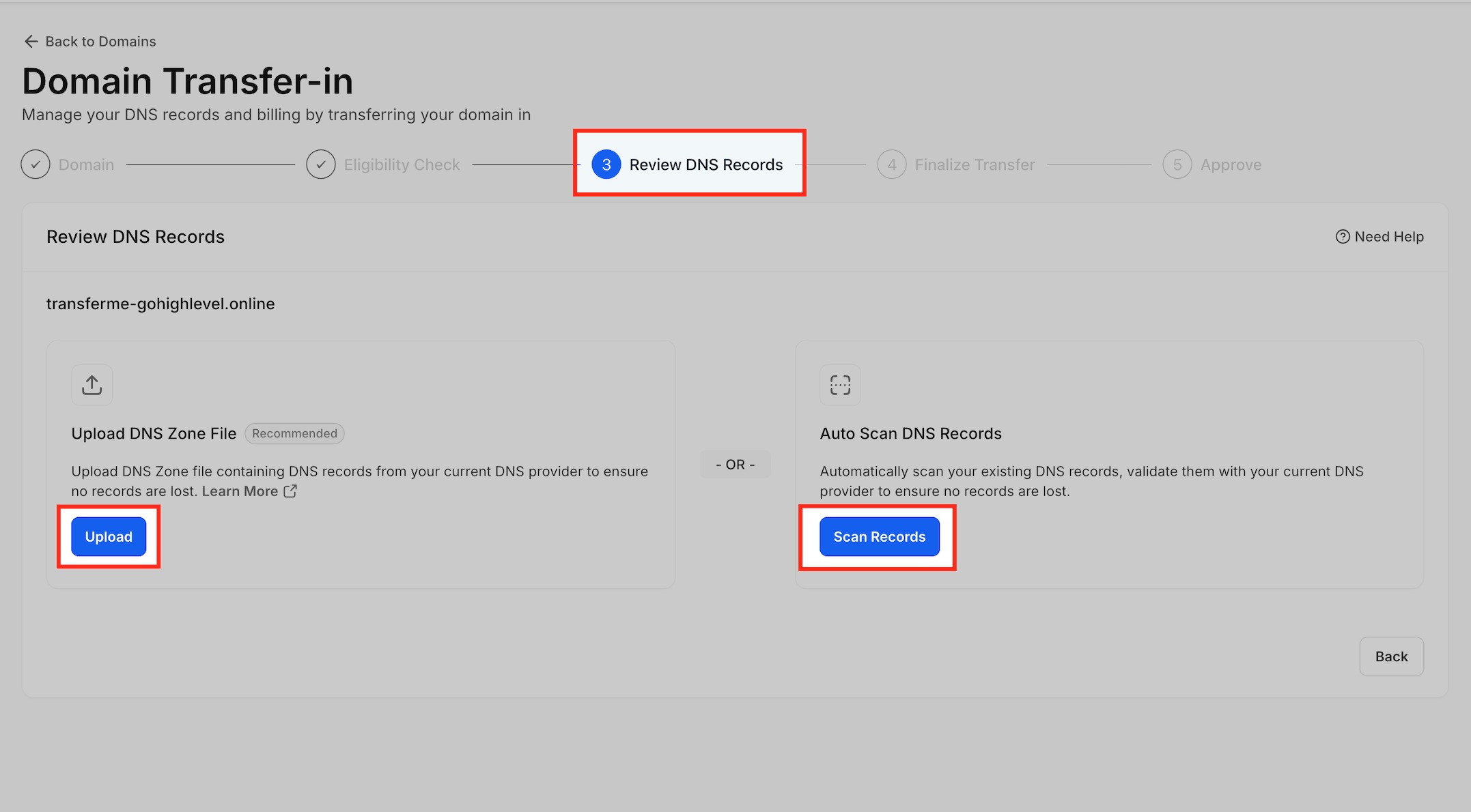 This method is convenient and requires no prior setup. In this method, your existing DNS records will be automatically scanned, but some of the existing records may not get detected in the scan. To avoid interruptions in your existing connected services like funnels, websites, etc., post-transfer, it is highly recommended to manually cross-check the scanned records with your records at your current DNS provider or registrar and add/edit records if required.