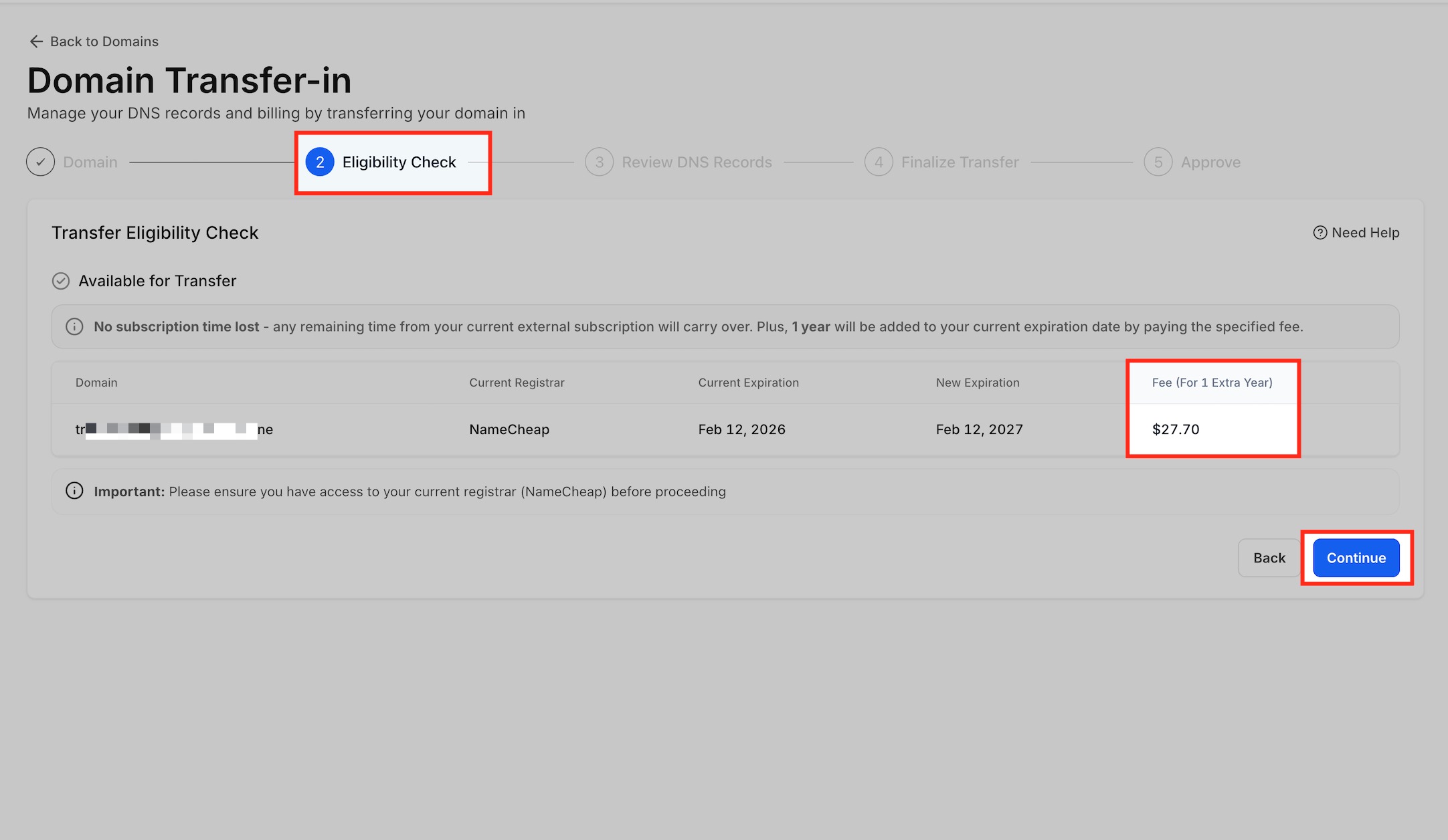 The system runs an eligibility check to confirm ICANN requirements. If the domain is eligible for transfer, you can continue with the transfer process.