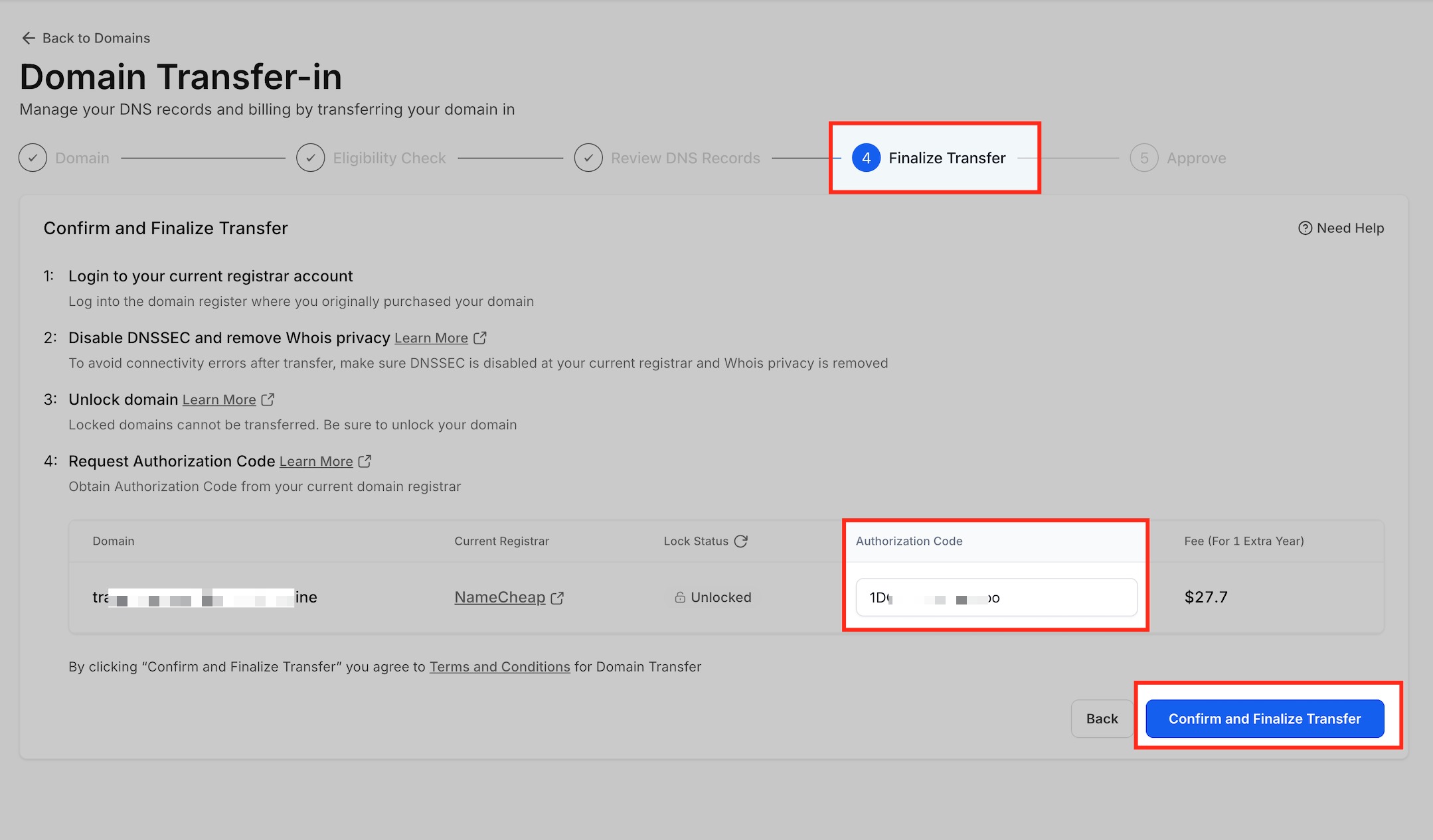 The Finalize Transfer step is where you complete the authorization process to move your domain from your current registrar (like GoDaddy, Namecheap, IONOS, etc.) to the software. This step ensures that your domain and related services continue working smoothly after the transfer.